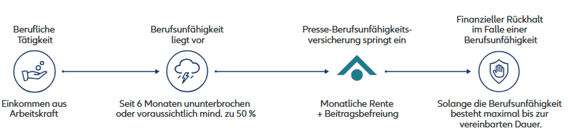 - Leistung der Presse-Versorgung: Monatlich 100 % BU-Rente ab 50 % Berufsunfähigkeit. Bei Berufsunfähigkeit müssen keine Beiträge mehr entrichtet werden.